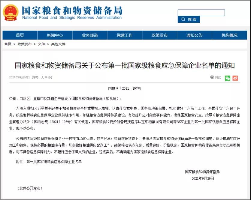 國家糧食和物資儲備局按程序認定68家企業(yè)為第一批國家級糧食應(yīng)急保障企業(yè),祥宇公司成功入選。